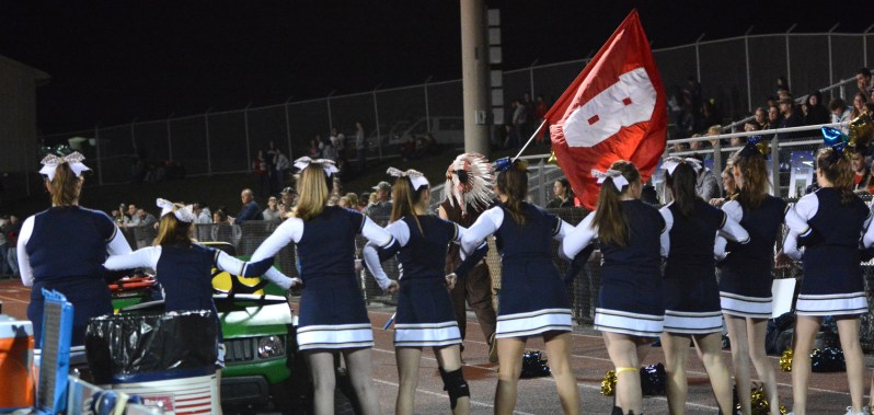 Bald Eagle cheerleaders link arms to stop the Bellefonte mascot, the Red Raider from running around the track in a victory lap after one of Bellefonte’s touchdowns on November 6, 2015. Bellefonte beat Bald Eagle in their annual showdown, the Curtain Bowl 43-7.